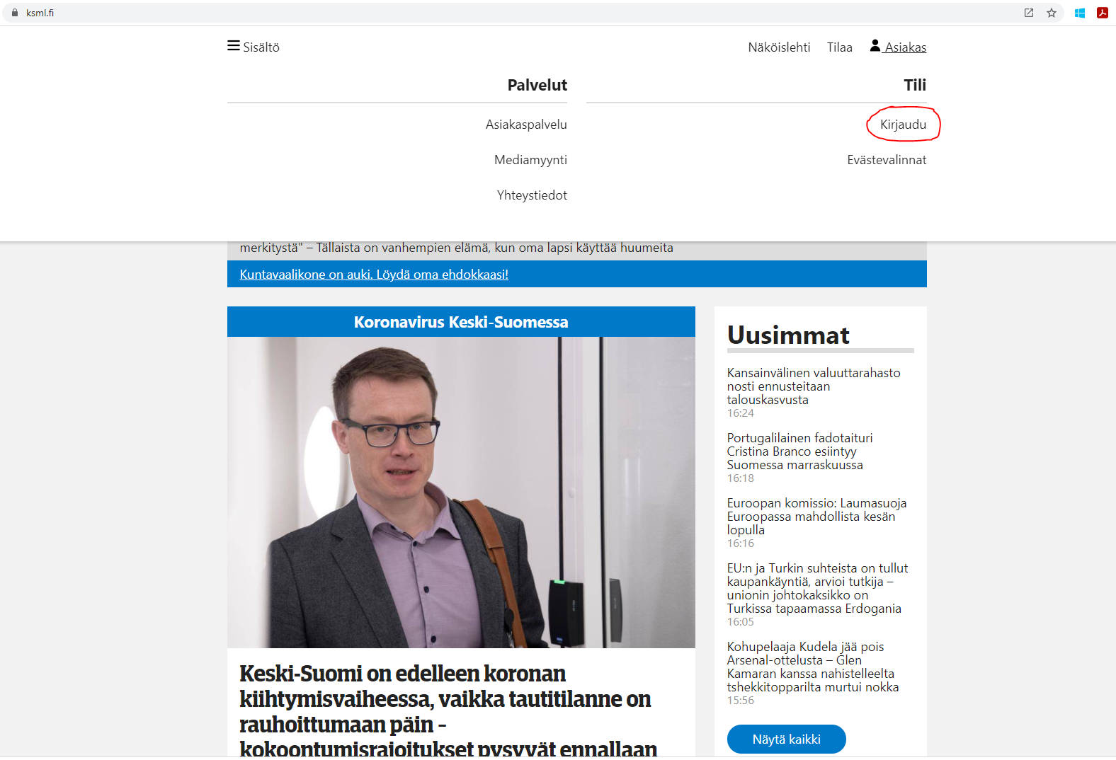 2. Nyt olet valmis lukemaan juttuja Forssan Lehden verkkopalvelussa. Kirjaudu sisään Asiakas – valikossa, sivun oikeassa yläkulmassa. HUOM! Ensimmäisellä kerralla kaikkiin uutissivustoihin on kirjauduttava. Jatkossa selaimet muistavat tunnukset, mikäli selaimessa sellaiset ovat sallittuja.