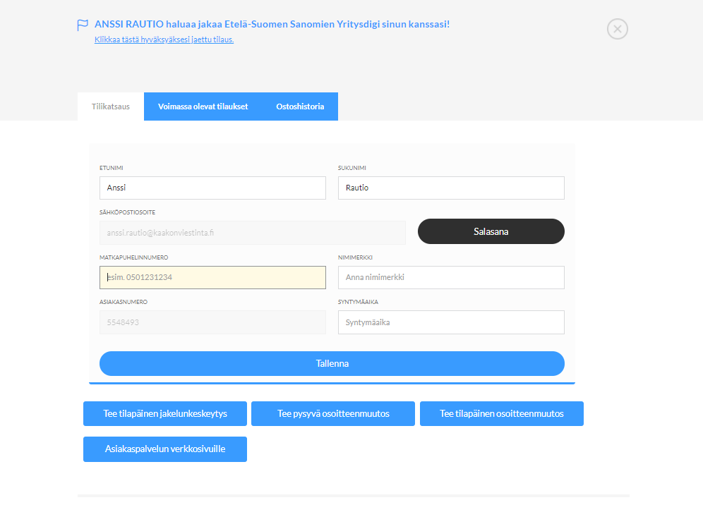 1. Olet saanut yrityksenne yhteyshenkilöltä sähköpostin, josta löydät linkin tilauksen käyttöönottoon. Luo Mediatunnus tai kirjaudu palveluun sähköpostiin saamasi linkin avulla. Hyväksy ja tallenna jaettu tilaus. Huomioithan, että sinun tulee luoda Mediatunnus tai kirjautua sisälle sillä sähköpostiosoitteella, johon olet viestin saanut.