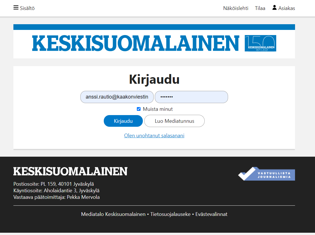 Mikäli sinulla on jo Mediatunnus samalla sähköpostiosoitteella mihin tahansa Mediatalo Keskisuomalaisen tuotteeseen, voit kirjautua suoraan sisälle. Mikäli sähköpostiosoitteella ei vielä ole Mediatunnusta, sinun tulee luoda se saamasi linkin kautta.