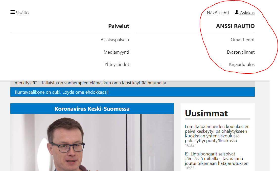 2. Nyt olet valmis lukemaan juttuja Hämeen Sanomien verkkopalvelussa. Kirjaudu sisään Asiakas – valikossa, sivun oikeassa yläkulmassa. HUOM! Ensimmäisellä kerralla kaikkiin uutissivustoihin on kirjauduttava. Jatkossa selaimet muistavat tunnukset, mikäli selaimessa sellaiset ovat sallittuja.