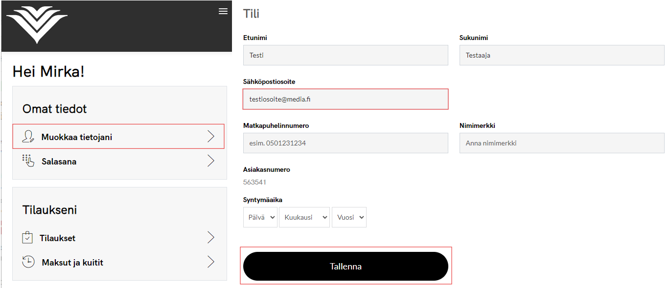 - Valitse Omat tiedot -valikosta kohta Muokkaa tietojani ja vaihda sähköpostiosoitteesi uuteen ja paina tallenna.
