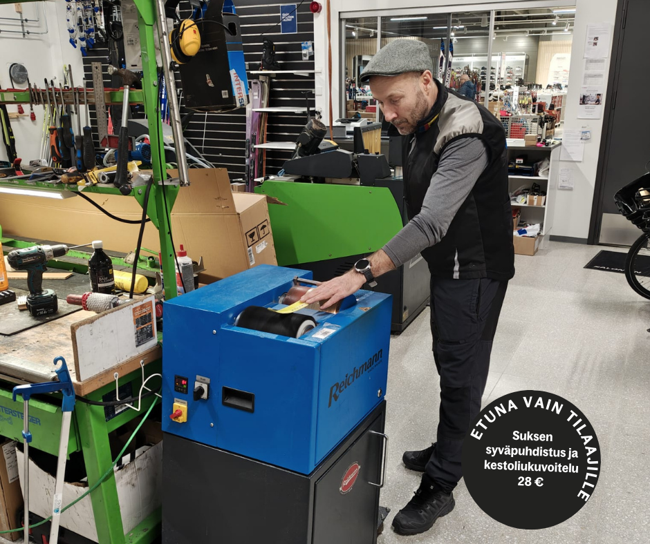 Suksen syväpuhdistus ja kestoliukuvoitelu Reihmann-voitelukoneella nyt 28 € (norm. 40€).
