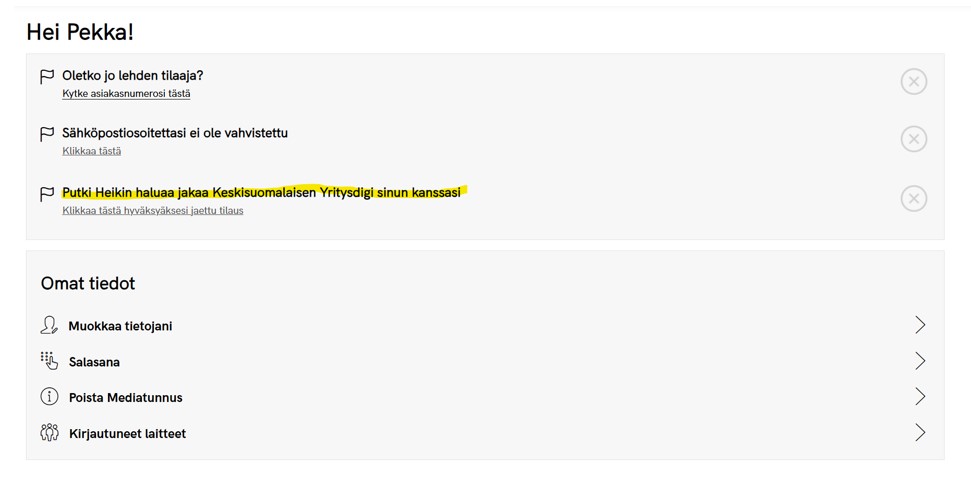 2. Kun vastuuhenkilöllä on Mediatunnus ja siihen on Yritysdigitilaus kytketty, hän voi jakaa käyttöoikeuksia seuraavasti: