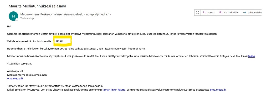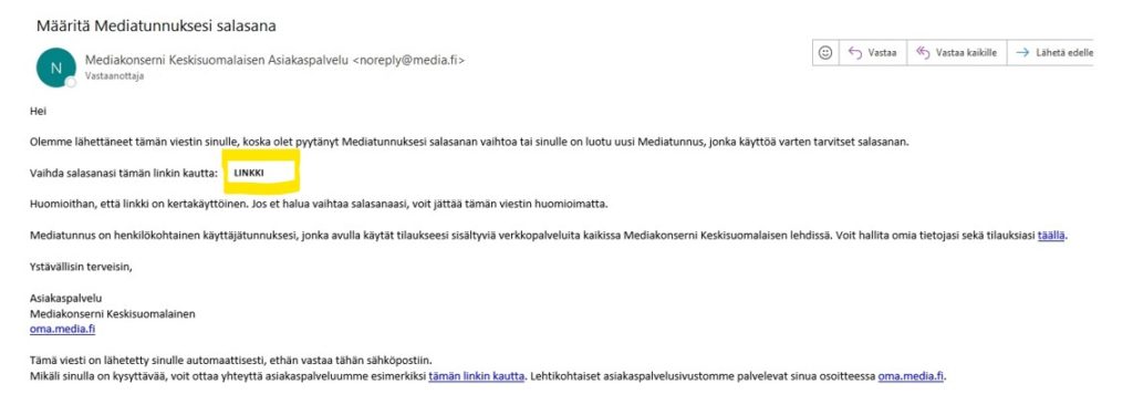 • Avaa saamasi sähköpostiviesti ja klikkaa viestissä olevaa linkkiä (linkki piilotettu esimerkkikuvassa, mutta löytyy kyseisestä kohdasta).