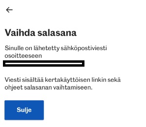 • Näet vahvistuksen, kun sovellus on lähettänyt sähköpostiisi kertakäyttöisen linkin salasanan vaihtamiseen.
