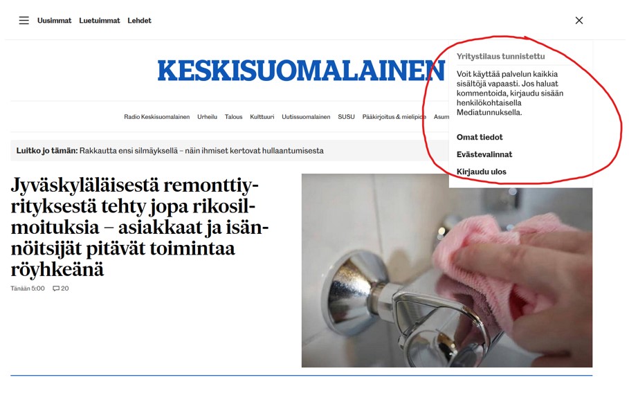 6. Tämän jälkeen juttuja pääsee lukemaan kirjautumalla uutissivuston (esim. ess.fi, ksml.fi ) Asiakas – valikossa (hahmokuvakkeen takaa).